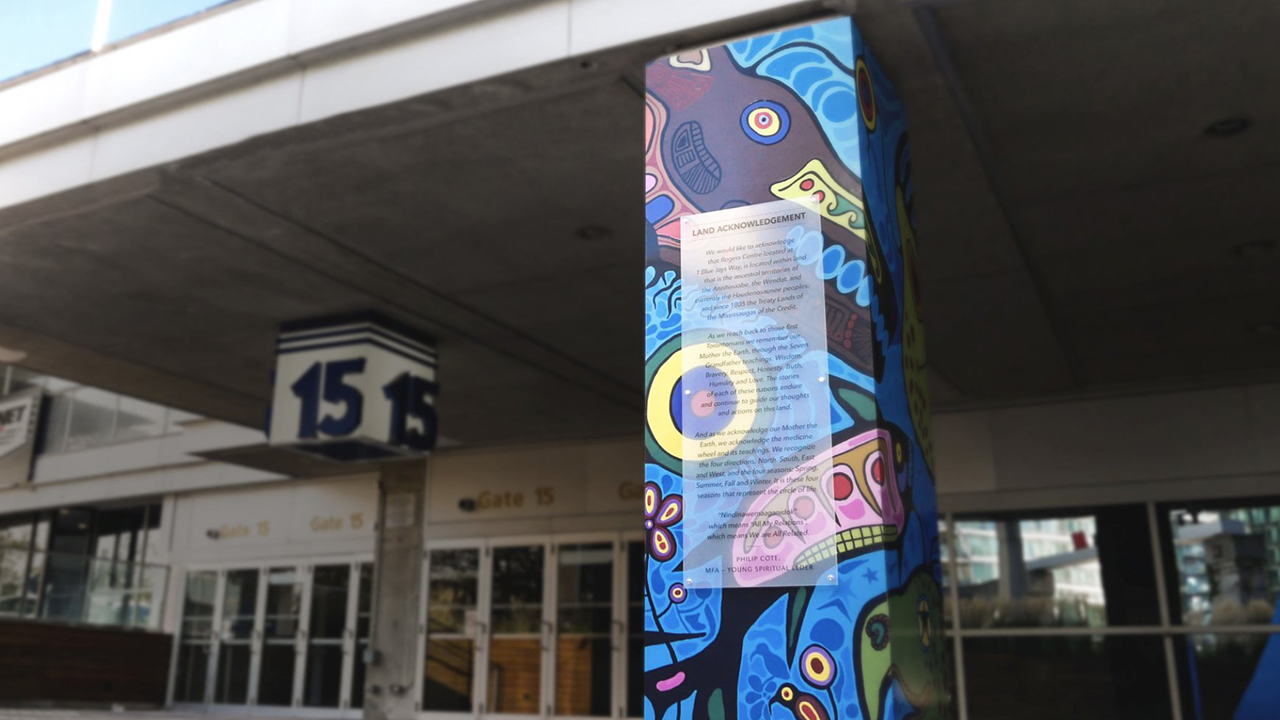 In honour of Orange Shirt Day, a land acknowledgement and artwork by Philip Cote – an artist and Ancestral Knowledge Keeper from Moose Deer Point First Nation – has been installed at Rogers Centre outside at Gate 15 and inside at Section 102. pic.twitter.com/em2NFA6O5k