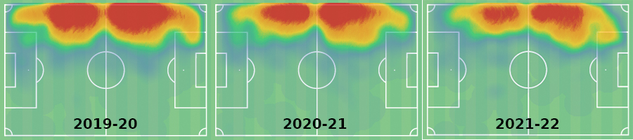 Larin was especially dominant in the air, as he’s been all season. His xG remain in line with last year, but he overachieved his xG in 2020-21, so a regression was expected. Regardless, he continues to produce quality chances.