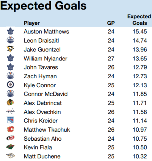 Let’s start with expected goals. Do not be afraid of this concept, which can crudely be understood as shot attempts but with quality considered. If an attempt is from the slot or off a rebound or rush, we’re more likely to expect it to go in, right? That’s all this stat is. Guys who have a high number of expected goals, shockingly, tend to have a lot of actual goals. Here is the leaderboard from the league at large: