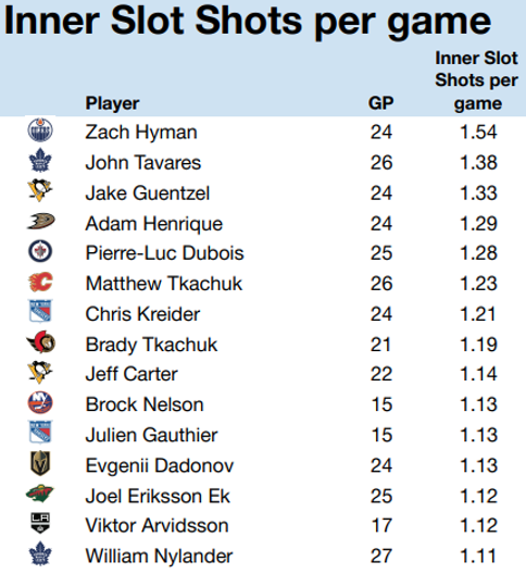 You don’t get on the expected goals leaderboard without getting shots from the slot, and so you won’t be surprised to see those same three Leafs names show up below: