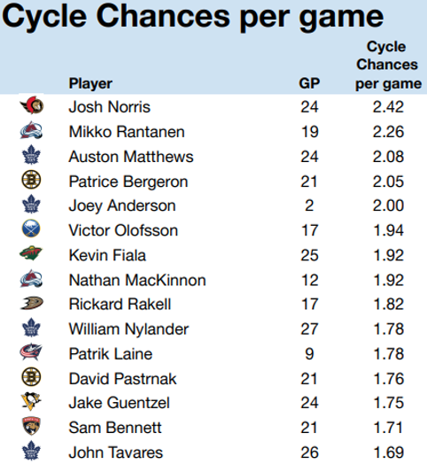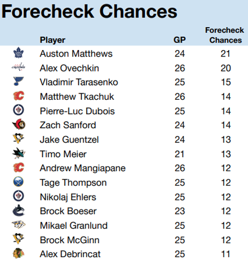Of course, Matthews and Marner are huge for the Leafs. Matthews shows up everywhere, as you surely noted above. He’s also the only Leaf on the “forecheck chances” board, which highlights how effective he is at getting under sticks and creating chances.